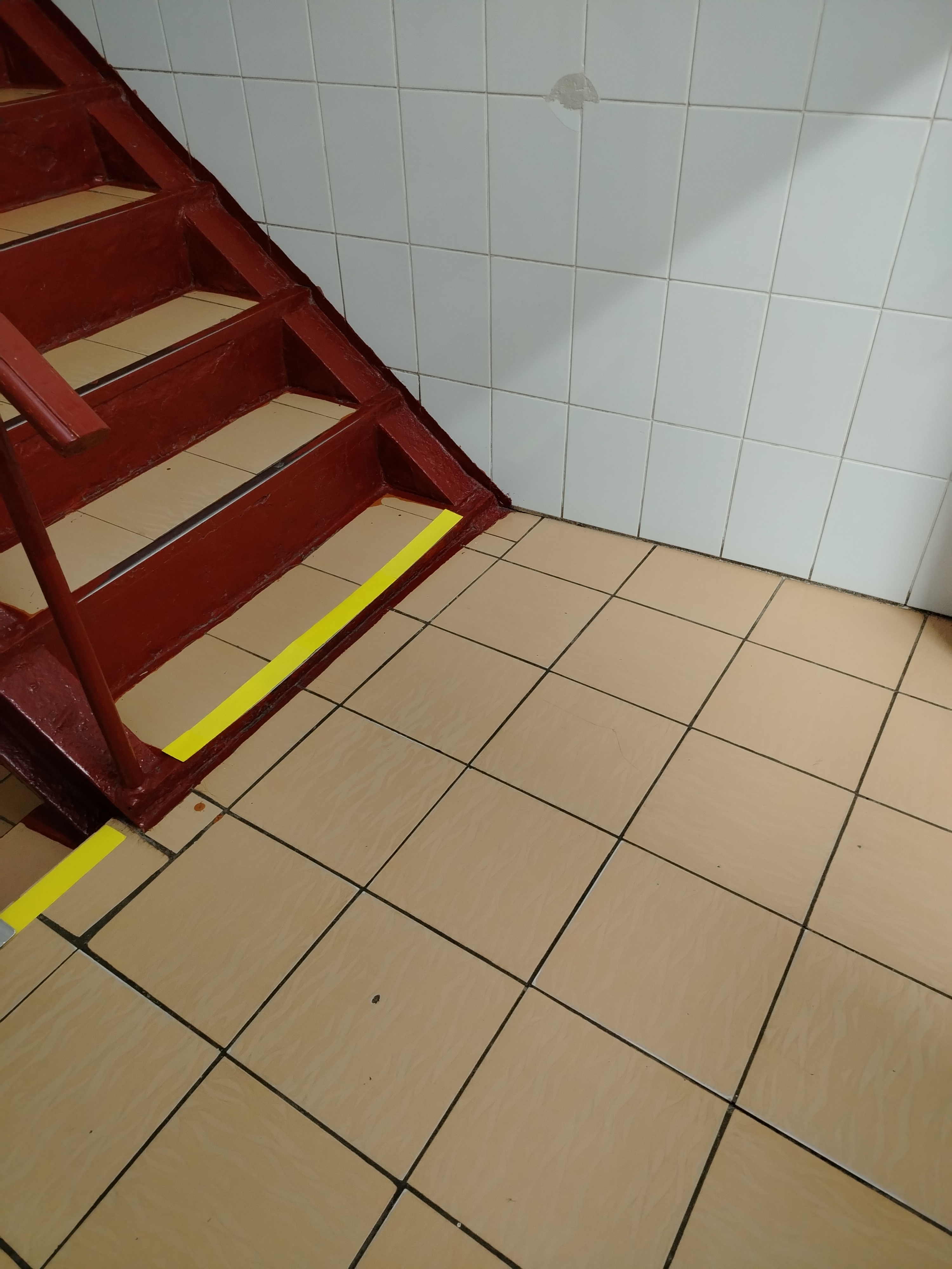 Входная группа оборудована расширенной распашной дверью с порогом 3 см, при входе в здание обозначена контрастной линией желтым цветом.
